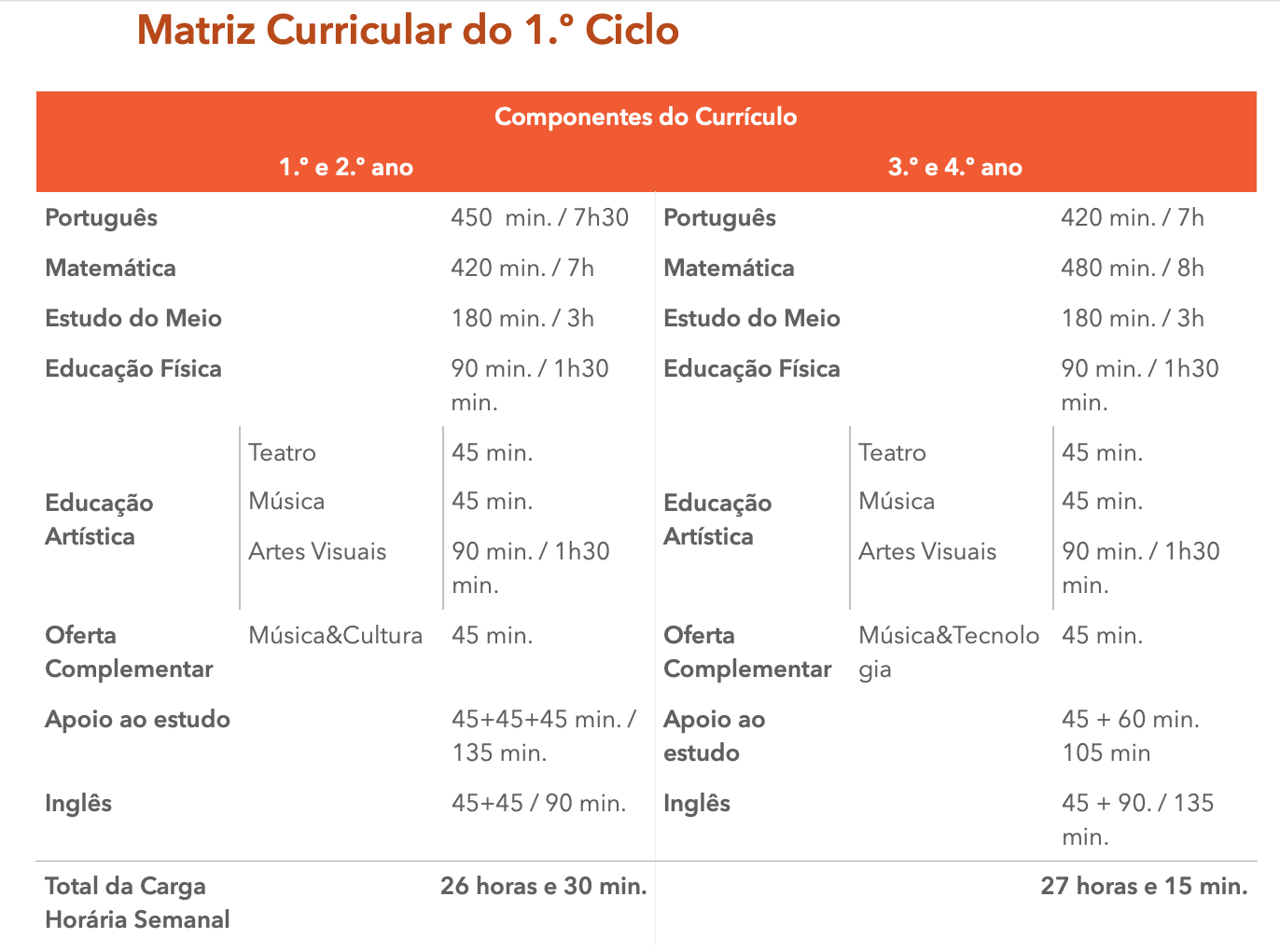Veja o plano curricular do 1º ciclo com mais detalhe, aqui.