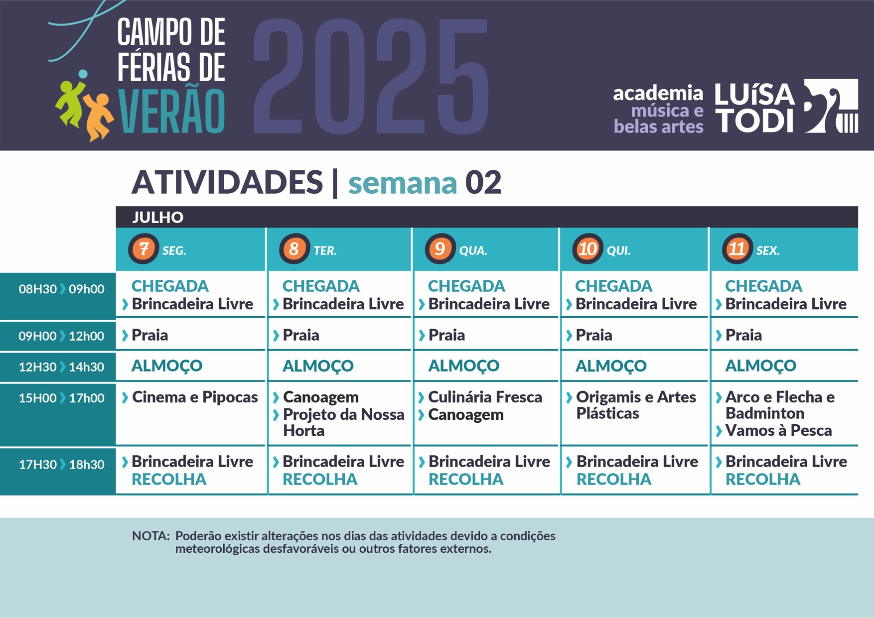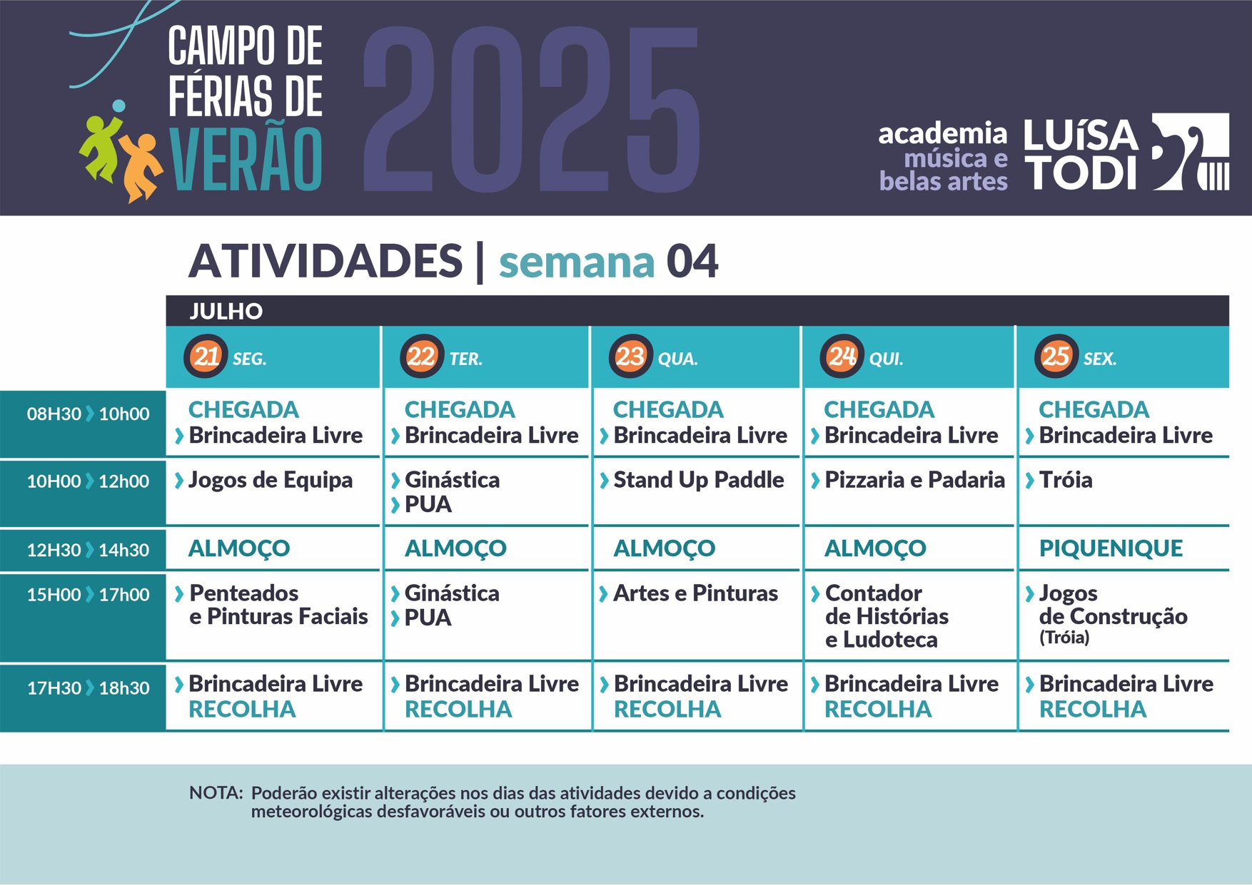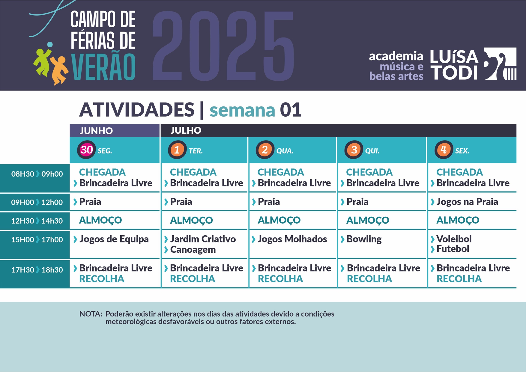 Ao longo destas semanas, os participantes terão acesso a atividades lúdicas, pedagógicas e artísticas, dinamizadas por uma equipa experiente de monitores contratados pela Academia. Música, artes plásticas, expressão dramática, jogos e momentos de convívio farão parte do dia a dia, sempre num ambiente seguro, estimulante e divertido.